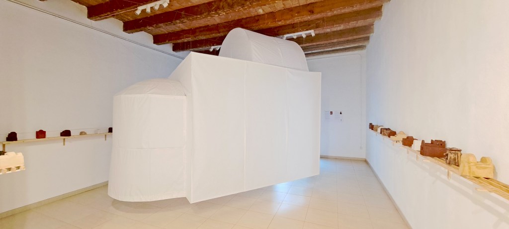 Sin embargo, en esta exposición, la ermita deja de ser un mero lugar solitario. Unidas por un hilo espiritual invisible, todas estas moradas están, ciertamente, aisladas, pero al mismo tiempo juntas. En la sobriedad de su forma y la austeridad de sus materiales, comparten la modestia de su celda, la búsqueda de sí mismo y del Otro, el retiro, pero fraternalmente, en una comunidad solidaria cuyo centro es esta instalación, tan imponente como ligera, casi inmaterial: la ermita Padre. Suspendida entre el cielo y la tierra, encarna el lugar de elevación espiritual, desprendido de las cargas terrenales, hacia el cual convergen los cantos del absoluto.