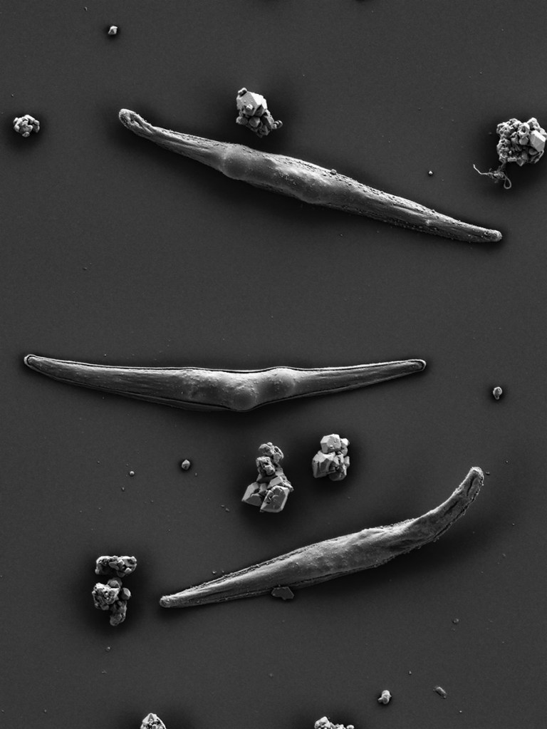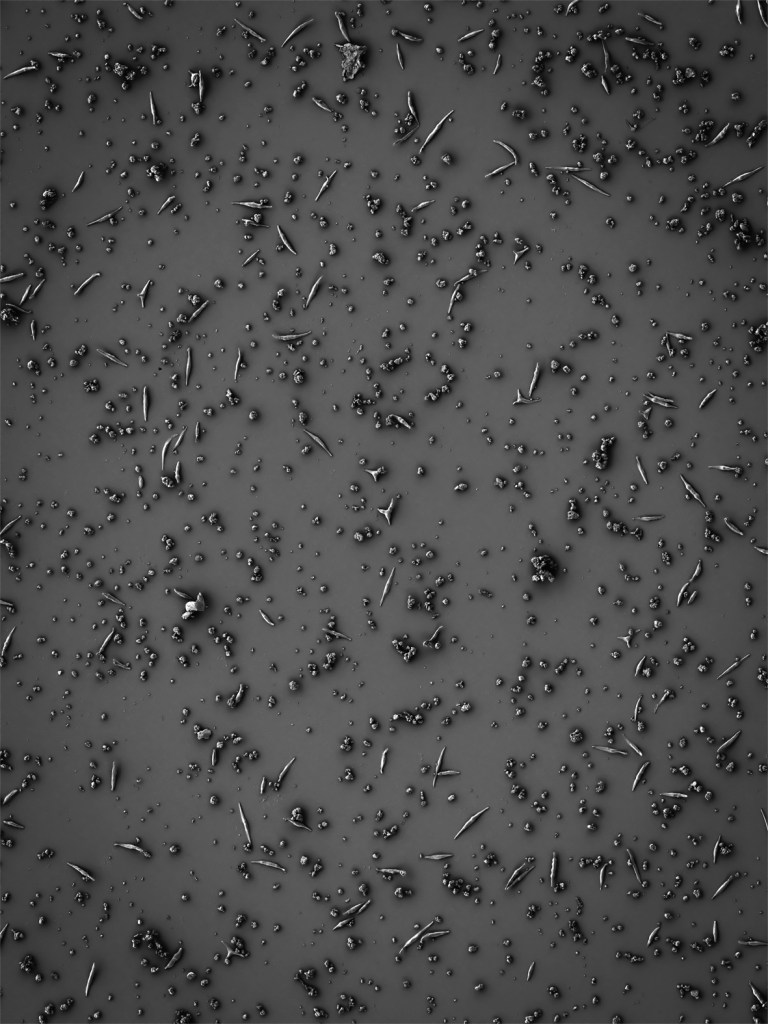 Las imágenes topográficas de alta resolución, obtenidas mediante Microscopía Electrónica de Barrido de Emisión de Campo por el artista Luis Guzmán, documentan un viaje de exploración artística y científica a bordo de la Estación Espacial Internacional. Estas capturas revelan el resultado del envío a un ambiente de gravedad lunar de un cultivo de diatomeas marinas; algas unicelulares responsables de la producción de un 25 a 30 % del oxígeno presente en la atmósfera terrestre y que hacen posible la vida humana, entre muchas otras.