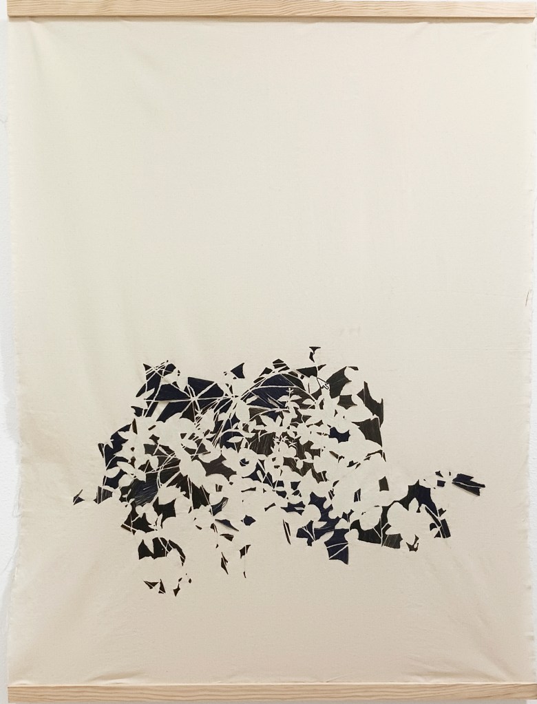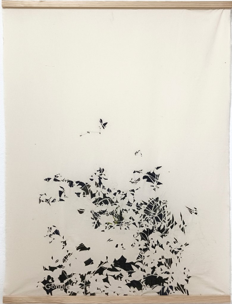 Sota un cel de píxels explores the position of the spectator in relation to our digital world, where our screens emerge as windows through which we observe, look, and become familiar with a world, both near and far. Drawing from Google Maps imagery and live cameras accessible online, Pastor engages in the interplay between observing the natural spaces and the creatures inhabiting them, and translating this world through painting and embroidery. The works employ the sensory, the gestural, and the tactile in contrast to the cold, flat surfaces of our screens, revealing the disruptions and imperfections, often absent from digital spaces. Through this act of translating, the images are transformed into physical form, coming to exist in yet another reality. In this game of being and not being, of seeing and not being seen, shielded by the screens of our devices, the works comment on dissociations from our own environment, and oftentimes, from our own bodies, through a dystopian attempt to connect with the surroundings.