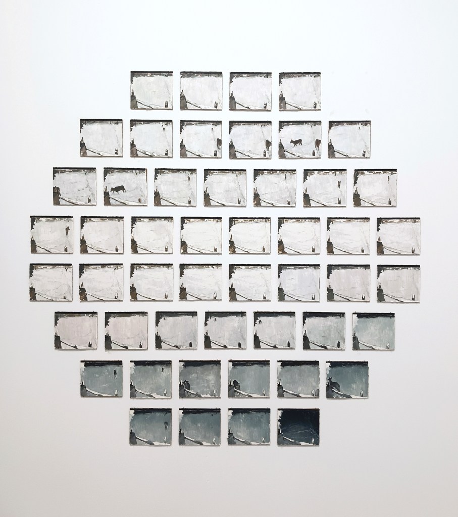 MIRANDA PASTOR, Si un cérvol apareix a la pantalla, oli sobre paper, 50 peces de 10 x 11 cm, mides variables, 2025.