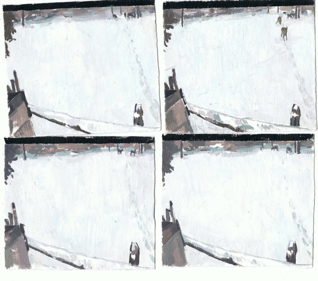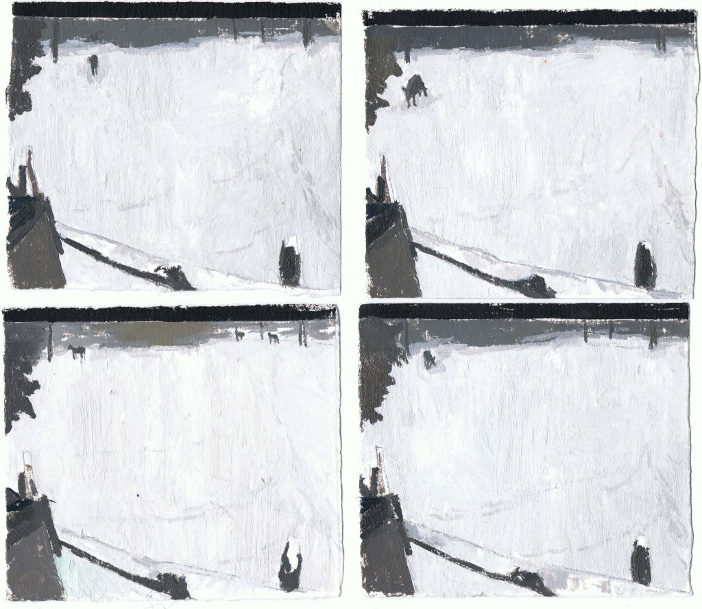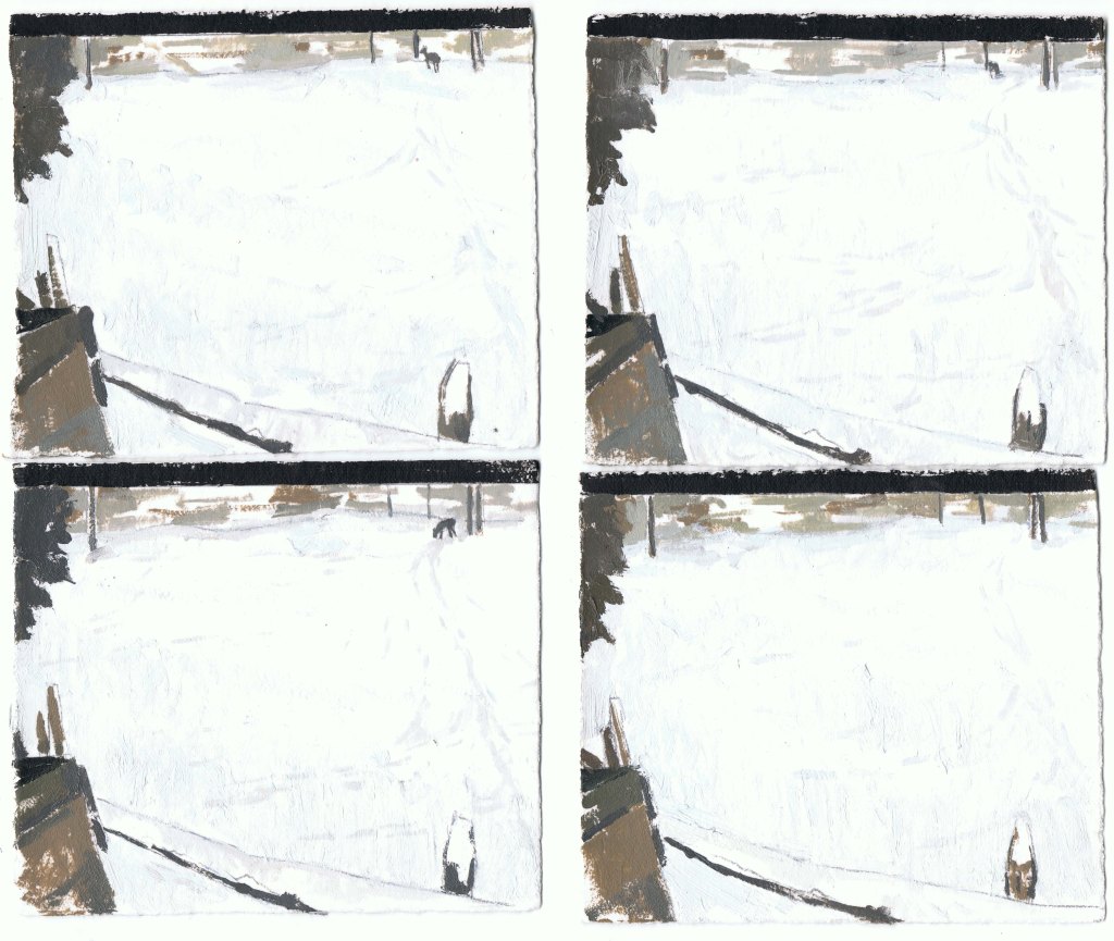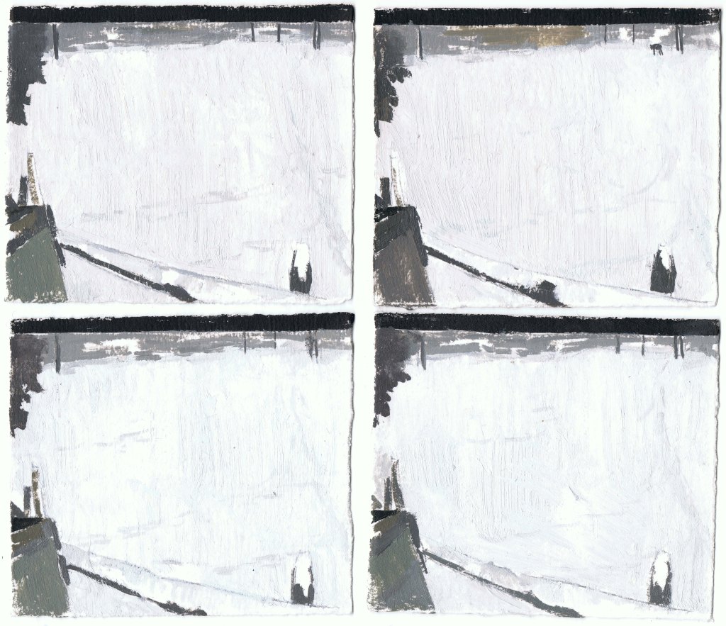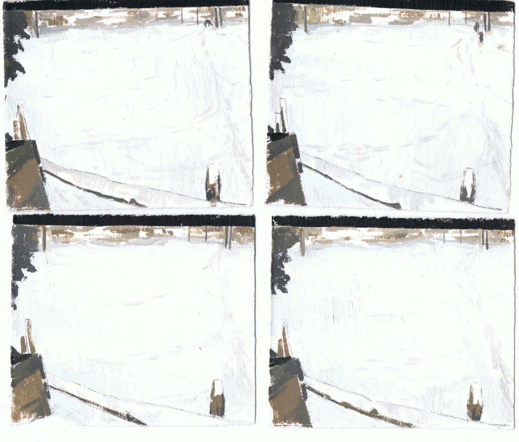 MIRANDA PASTOR, Niu a Gottenheim, hivern, oli sobre paper, 16 peces de 10 x 25 cm, mides variables, 2025.