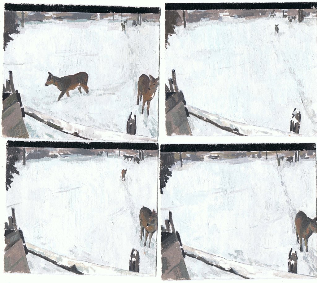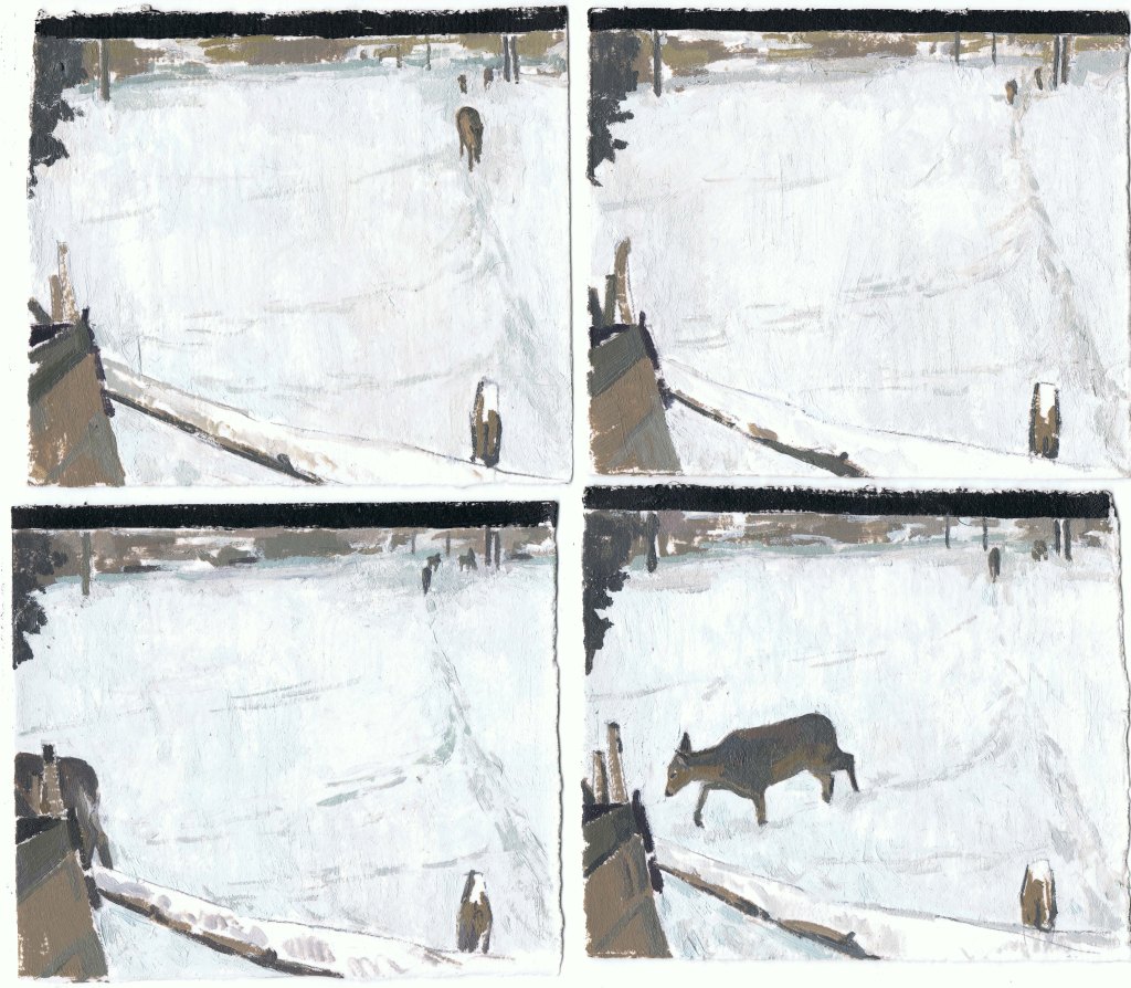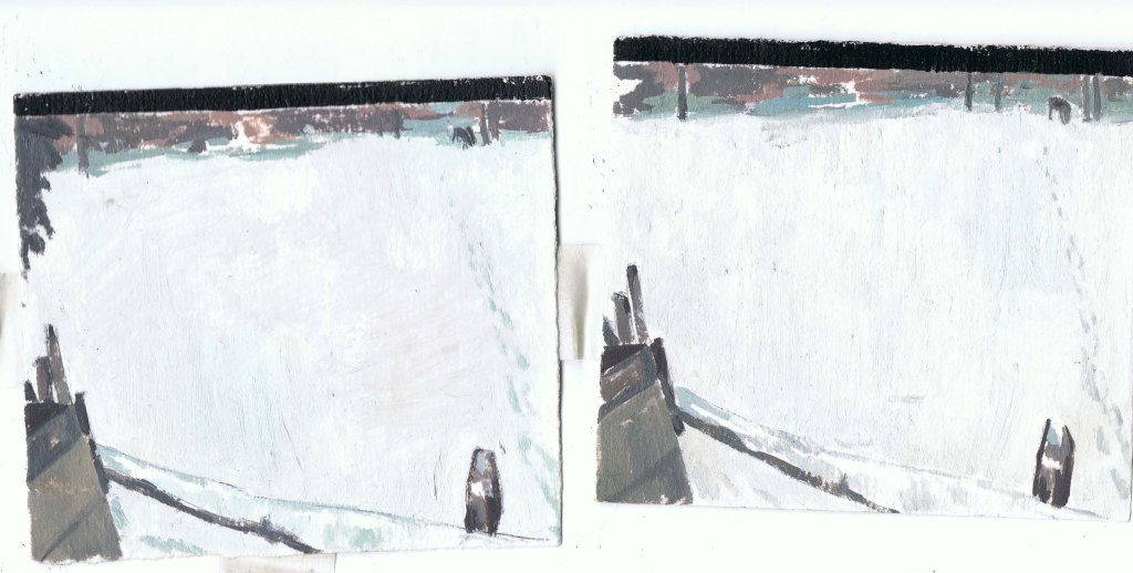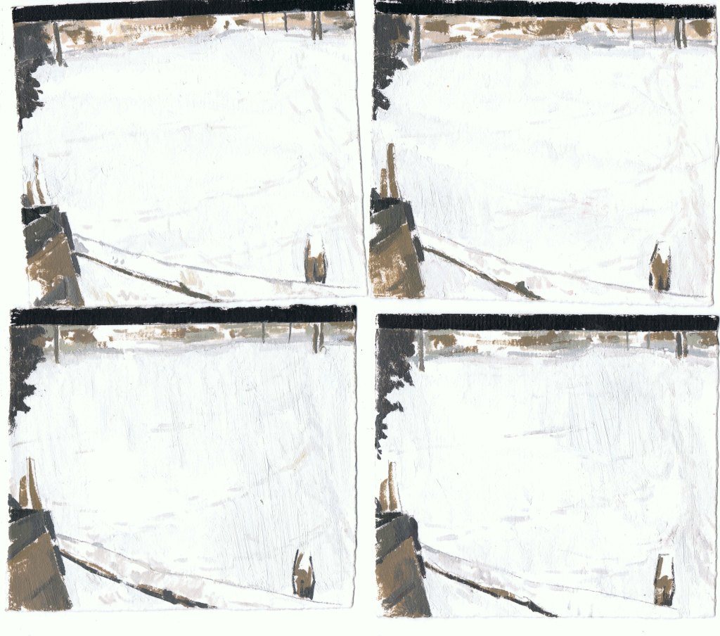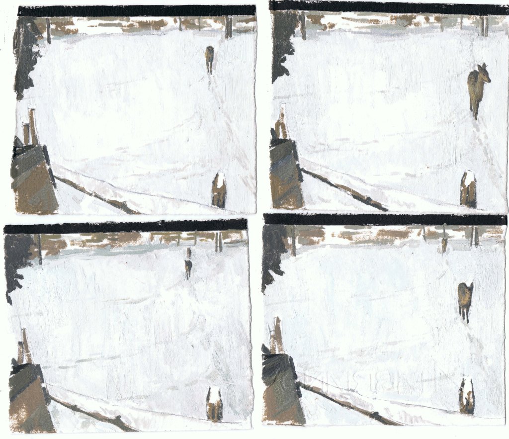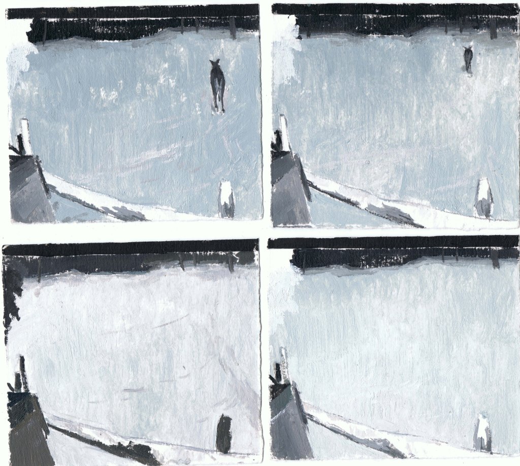 MIRANDA PASTOR, Niu a Gottenheim, hivern, oli sobre paper, 16 peces de 10 x 25 cm, mides variables, 2025.