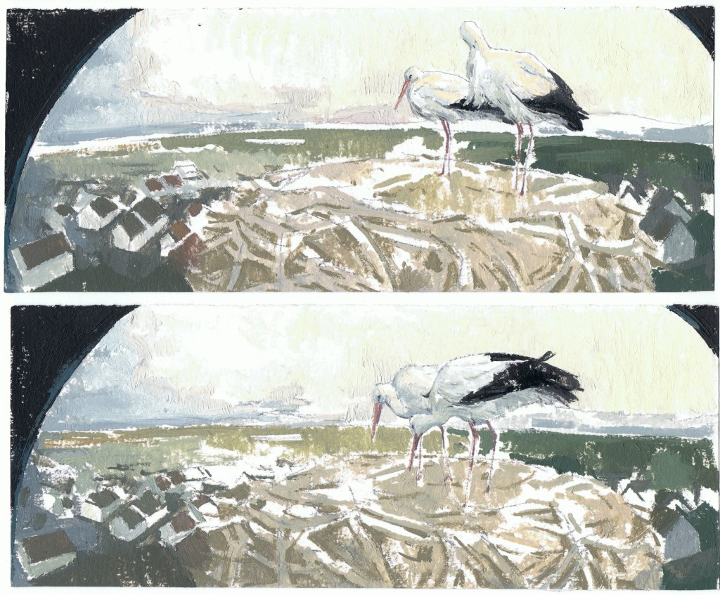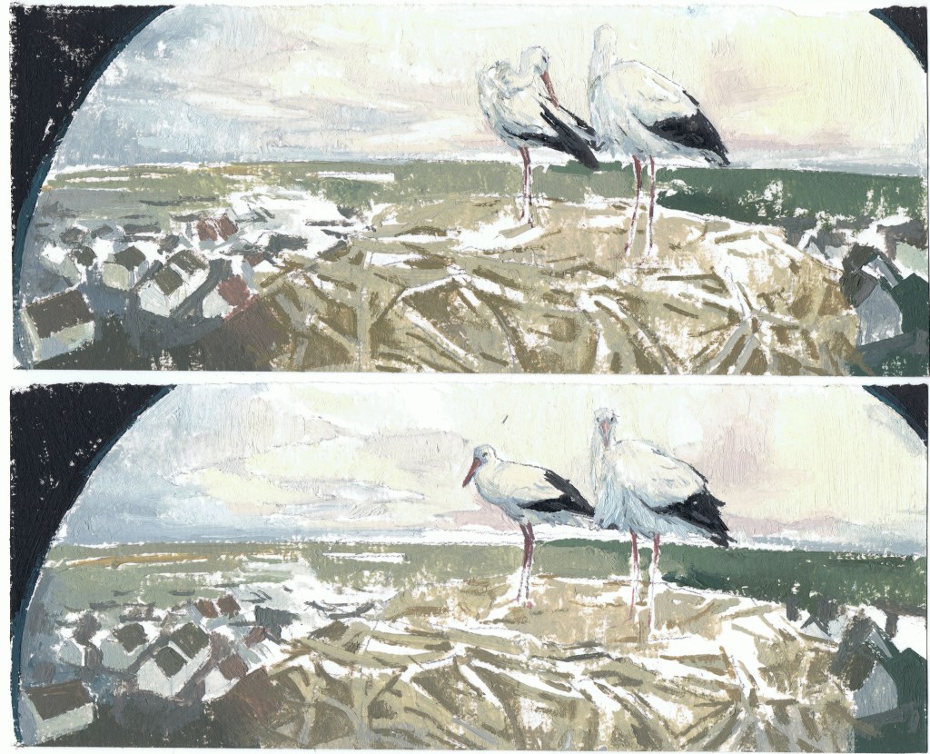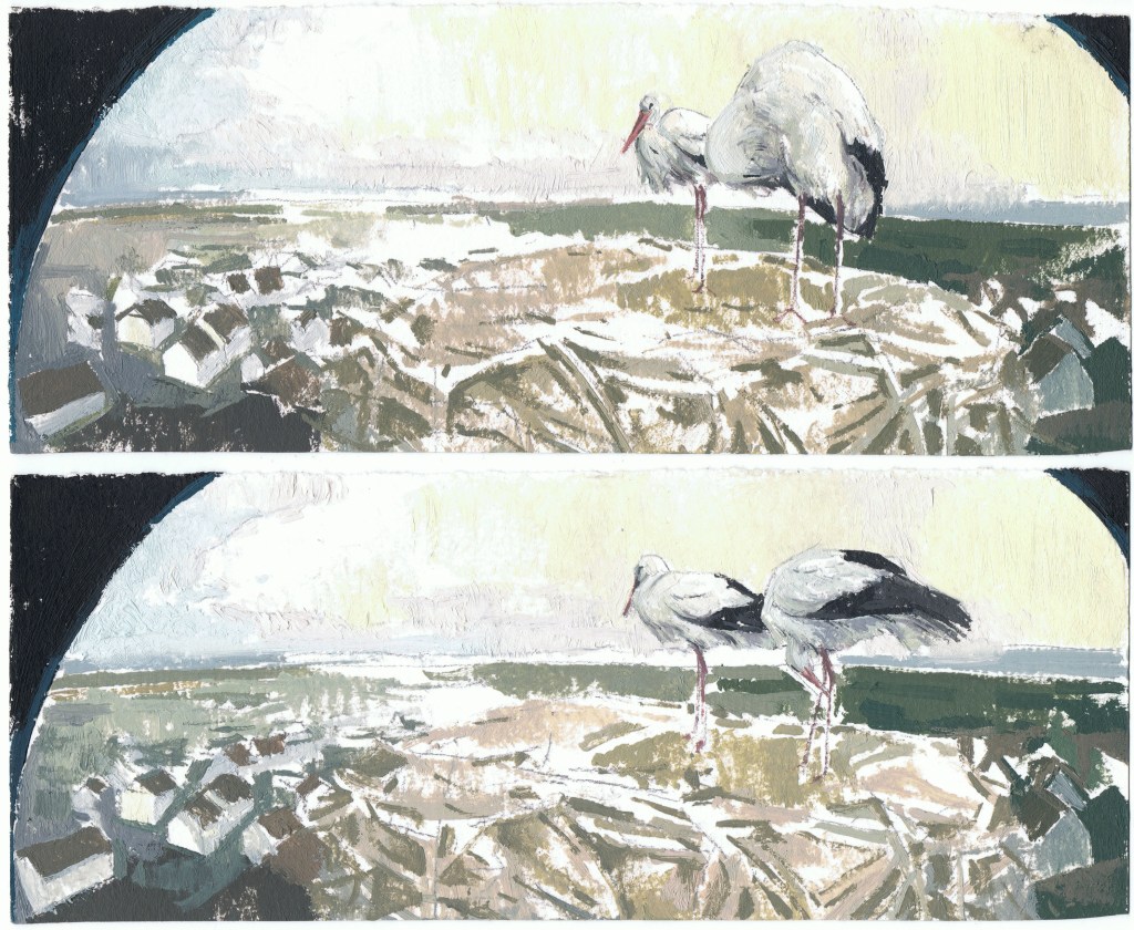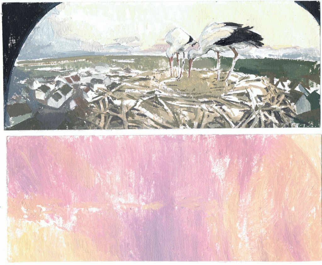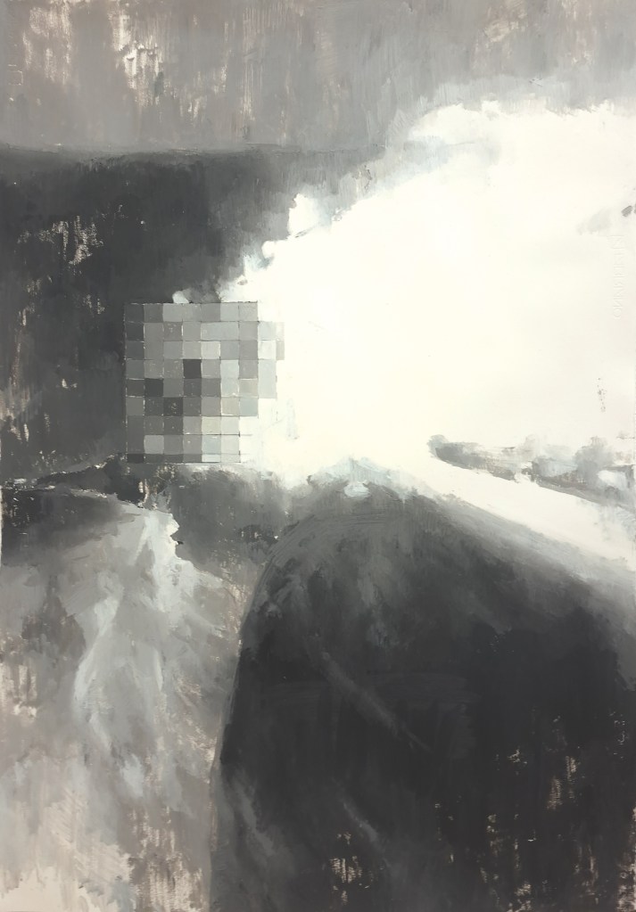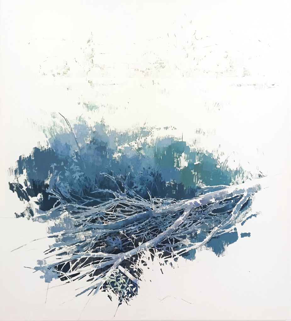 The act of observing is transformed into a sequence of paintings, through which Pastor not only highlights the element of temporality, but also contrasts the slow, deliberate nature of painting with the immediacy of our digital experience. Through a meticulous process of engaging with brushstrokes, needle and thread, she attempts to slow down the frame rate of the live recordings, as if to say: this moment has happened, and it won’t go unnoticed. In doing so, she reinforces the notion that natural environments operate in their own temporal rhythms, ones that feel increasingly distant from ours. The duality between digital and physical landscapes, between painting and pixel, the tactile and the virtual, reflect an underlying tension, the kind that invites us to reconsider our own pace of life and the potential to reconnect with natural environments.