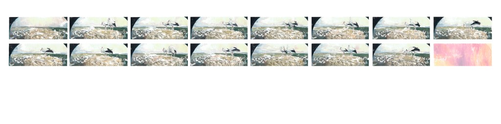 El acto de observar se transforma en una secuencia de pinturas, a través de las cuales Pastor no sólo pone de relieve el elemento de la temporalidad, sino que también contrasta la naturaleza lenta y deliberada de la pintura con la inmediatez de nuestra experiencia digital. A través de un meticuloso proceso de pinceladas, aguja e hilo, intenta ralentizar la velocidad de fotogramas de las grabaciones en directo, como diciendo: este momento ha sucedido, y no pasará desapercibido. De este modo, refuerza la idea de que los entornos naturales funcionan con sus propios ritmos temporales, cada vez más distantes de los nuestros. La dualidad entre el paisaje digital y el físico, entre la pintura y el píxel, entre lo táctil y lo virtual, refleja una tensión subyacente, la que nos invita a reconsiderar nuestro propio ritmo de vida y la posibilidad de volver a conectar con los entornos naturales.