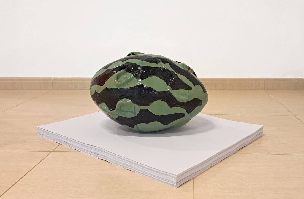 PACO RICO, The World Upside Down, cerámica esmaltada y papel, 40 x Ø 28 cm, 2025.